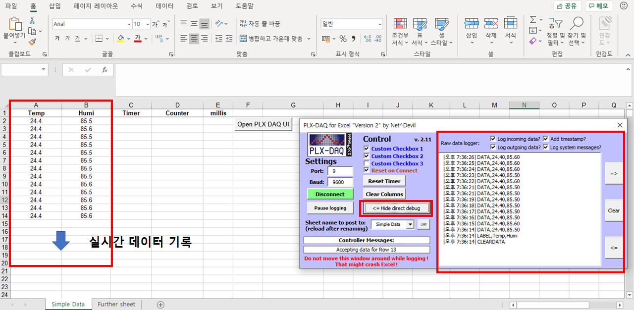 아래 엑셀 창에서 처럼 왼쪽 A, B열에 첫 행에는 열 이름 Temp, Humi 그 밑으로 2행부터 데이터가 실시간으로 기록됩니다. PLX-DAQ창에서 'Display direct debug'를 클릭하면 실질적으로 몇 시 몇 분에 데이터가 들어오는지 확인할 수 있습니다.