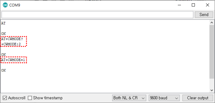 그리고 다시 시리얼 모니터에 AT를 입력하면 역시나 OK로 잘 응답을 해줍니다. ^^ 그럼 이제 와이파이에 접속해 볼까요? AT+CWLAP 명령어는 주변 Wifi 목록을 검색해주는 명령어입니다. 아마 입력하면 바로 진행될 수도 있지만 안되시는 분들은 AT+CWMODE? 명령어로 현재 모드가 몇 번인지 확인하고 AT+CWMODE=1이라고 입력하셔서 모드를 변경합니다.