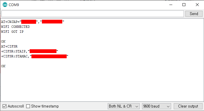 | AT+CIFSR | IP 주소 확인 | +CIFSR: STAIP, "할당된 IP주소" +CIFSR: STAMAC, "MAC주소" |